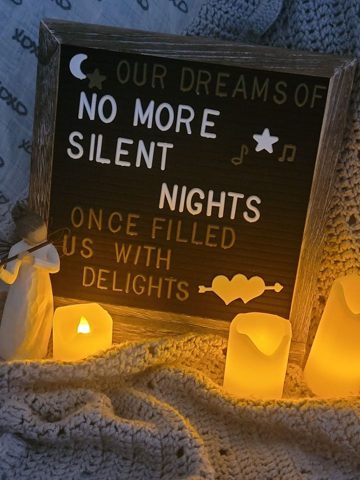 In our excitement to finally find out we were pregnant after a previous loss and infertility round 2, we decided to share our miracle birth announcement on Christmas day. I staged everything under the tree several days before with a reference to the Christmas carol, "Silent Night."